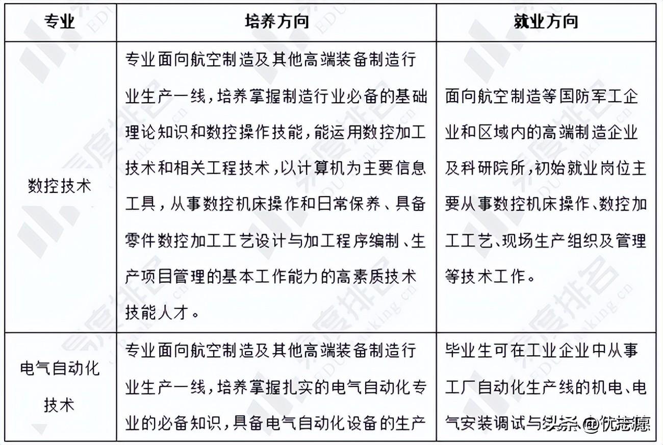 表2给出了成都航空职业技术学院部分专业培养及就业方向,部分专业毕业生可以就业于航空、国防军工等高端制造业,更多专业就业方向详见院校官网。