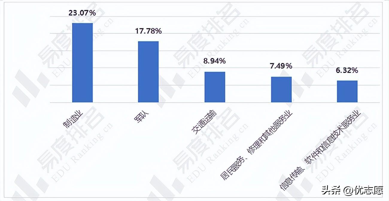 毕业生进入制造业的占比最高,为23.07%,其次是军队,占比为17.78%,交通运输行业毕业生占比为8.94%,进入信息传输、软件和信息技术服务业就业的毕业生较少。