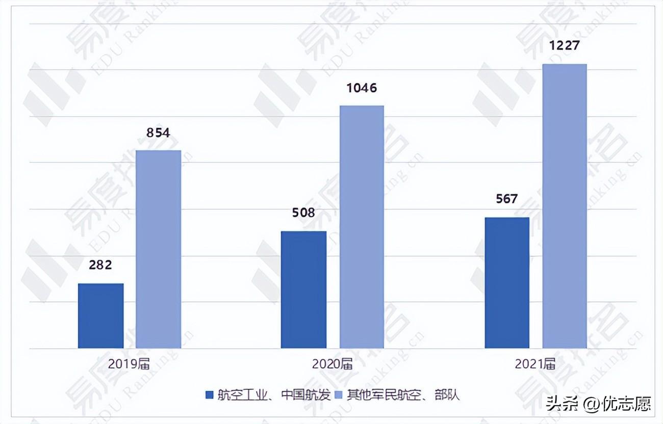 图3给出了近3届院校毕业生重点行业流向。可以看出毕业生主要进入其他军民航空、部队就业,就业人数上升明显,从2019届的854人上升至2021届的1227人,进入航空工业、中国航发的毕业生人数较少,同时就业人数增幅相对较低。