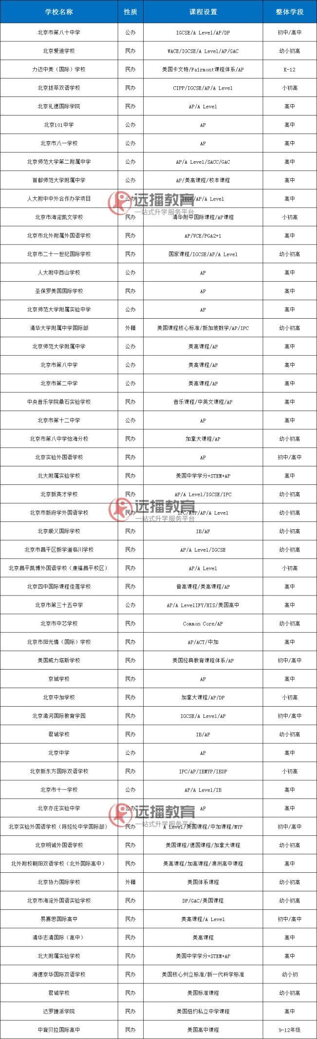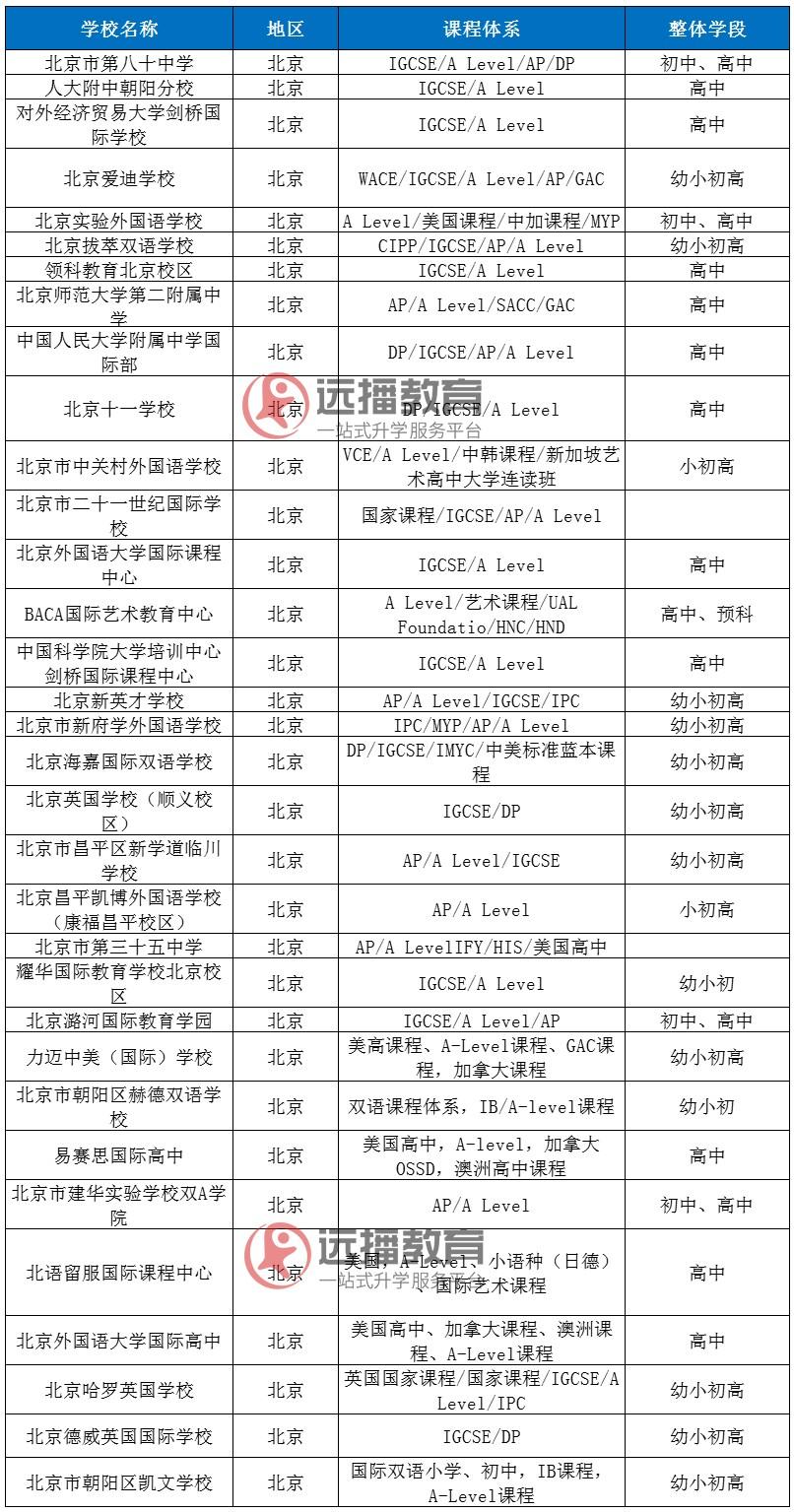 针对这几类国际学校,他们主要开设哪些课程呢?目前国际学校采用比较多的国际课程体系主要有五种,分别是:A-Level课程、IB课程、AP课程、加拿大BC课程、澳大利亚VCE课程。在这五种课程体系中,A-Level课程、I课程、AP课程是学校开设比较多的。那么开设这些课程的北京国际学校都有哪些呢?在这里也为大家进行了整理: