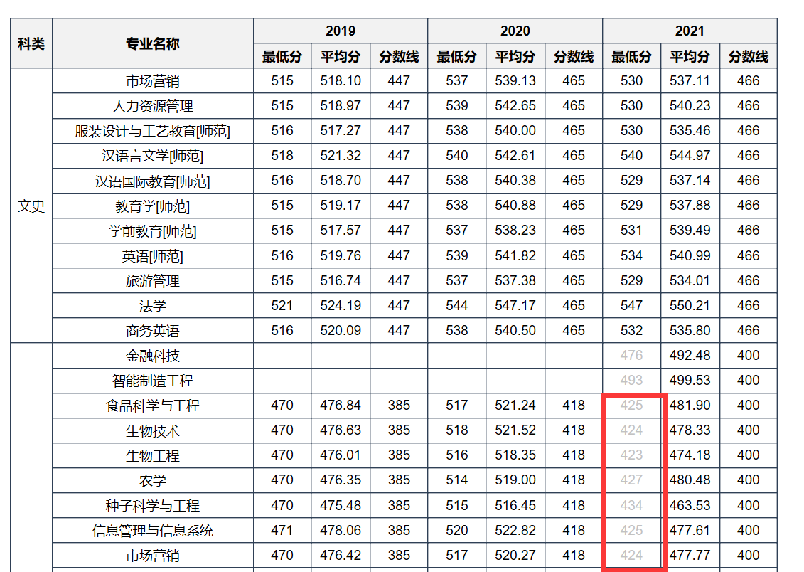尤其根据2021年河南科技学院二本批次理科各专业最低录取分来看,虽然如生物工程、生物技术、市场营销等专业,最低录取分数为423、424分,但其平均分却高达474、477分,该分数线位次为18万名左右。固然比2020年的514分,15万3000名低,但在今年理科477,排名176553,已经超过此类专业平均分数线,一切都在向好的方向发展。