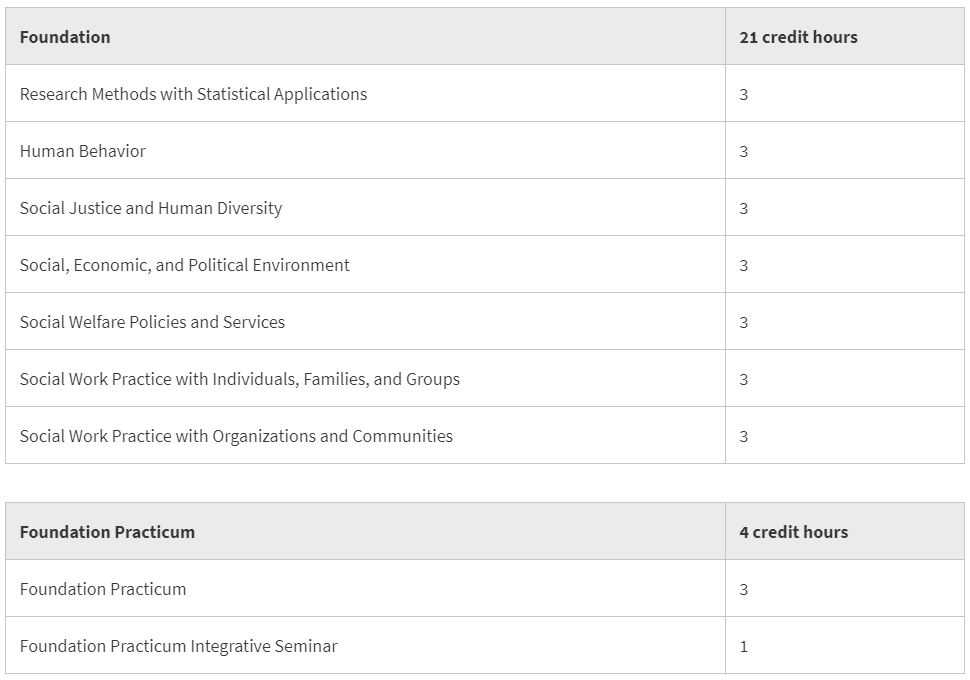 社会工作硕士课程包括:基础课程(21学分)、基础实践课程(4学分)、专业课程(21学分)、专业实践课程(5学分)、选修课(9学分)。