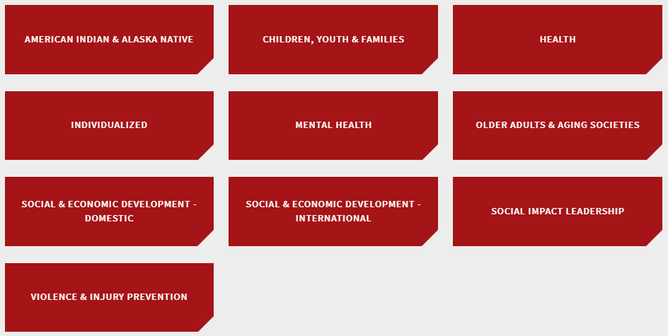 社会工作硕士项目提供多个Concentrations,包括:美洲印第安人和阿拉斯加原住民;儿童、青年和家庭;心理健康;老年人与人口老龄化;社会经济发展;暴力与伤害预防等等。