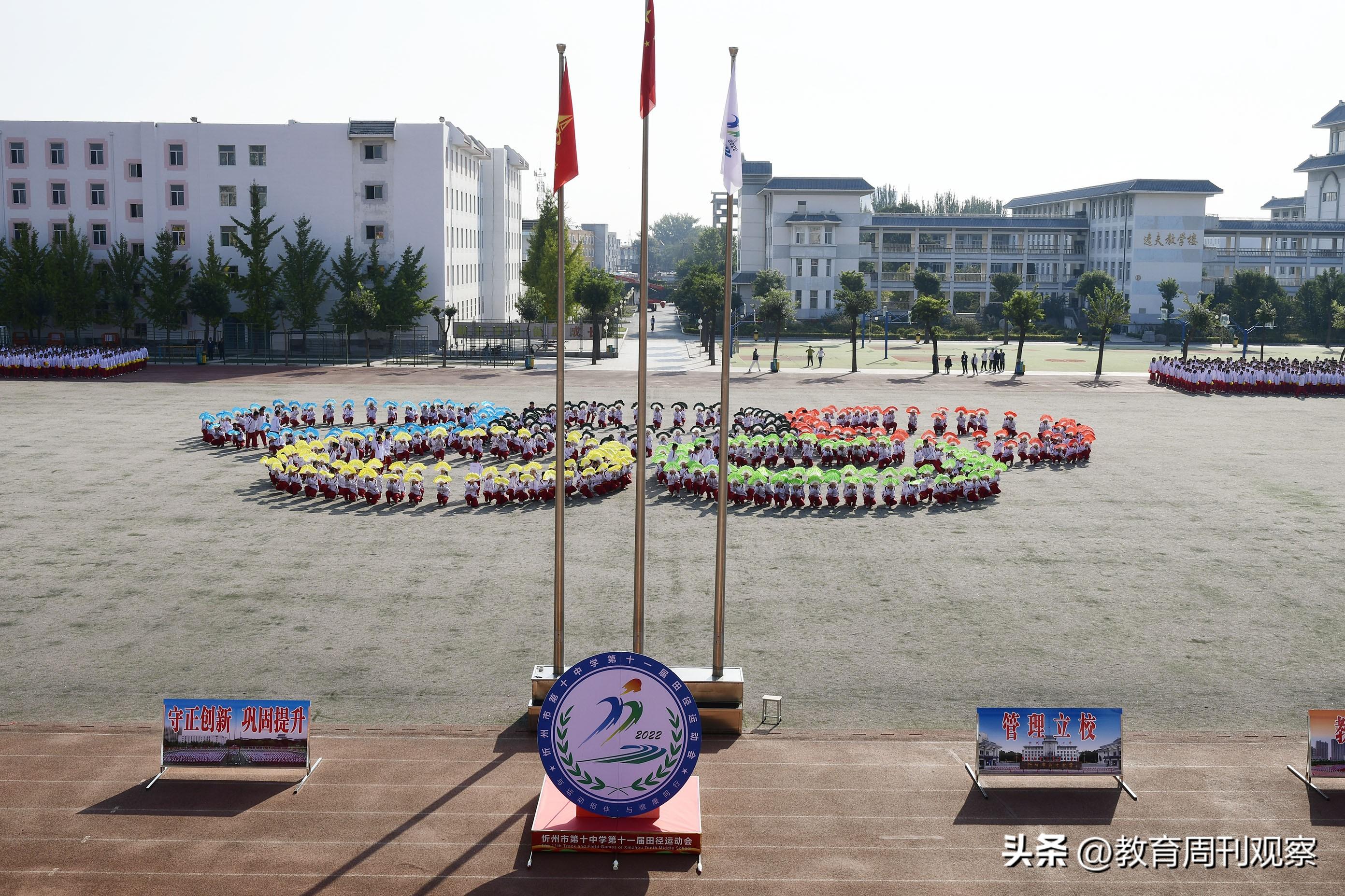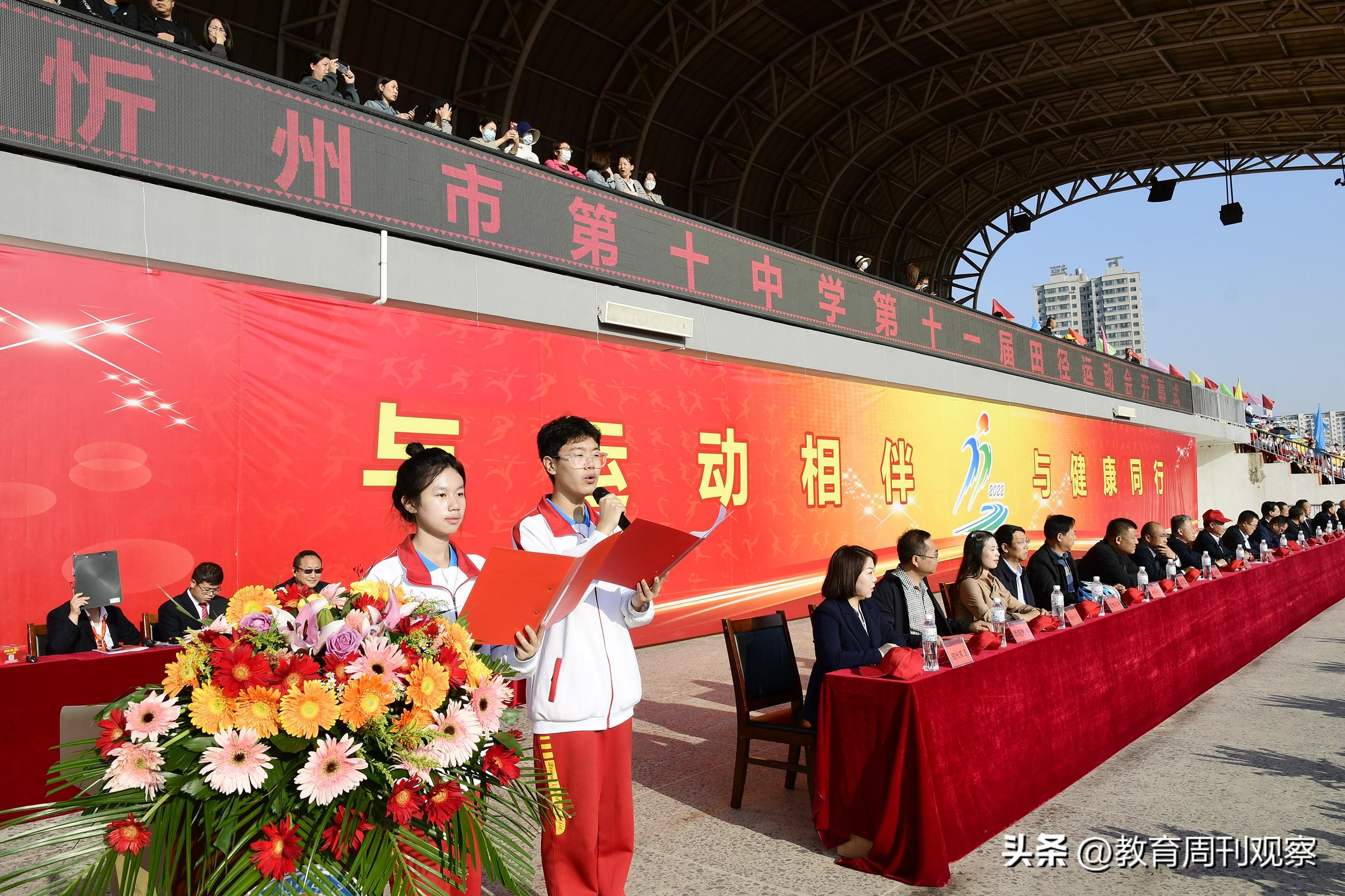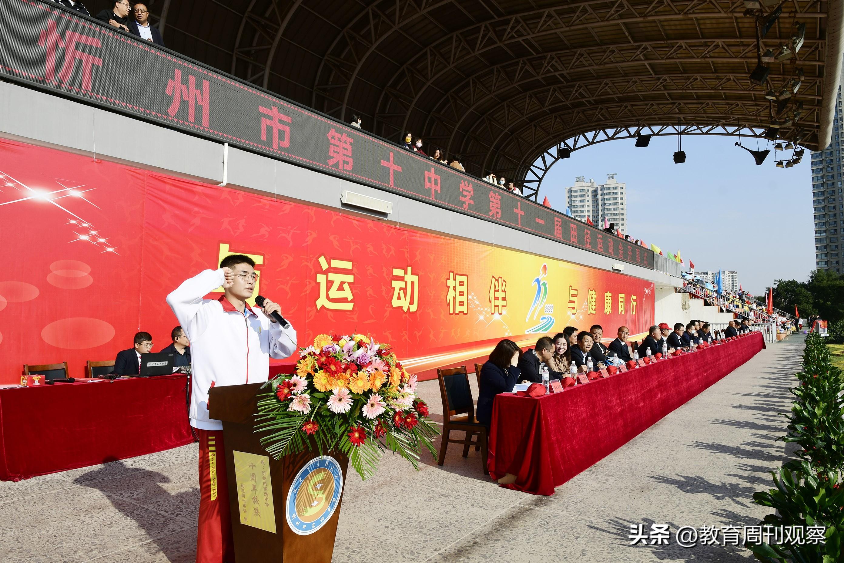 校长温高明在开幕式上致辞。他首先代表学校对长期以来关心支持学校建设与发展的各位领导、各兄弟单位和社会各界朋友表示衷心的感谢,向为本次运动会付出辛勤劳动的教职员工和同学表示亲切的问候,向参加运动会的裁判员、教练员、运动员致以崇高的敬意。温校长简要回顾了我校过去一年来的建设和发展成绩,深刻揭示了举办校运会的目的和意义,并对全体运动员和工作人员提出了具体要求和希望。 温校长讲道,2021年以来,我校在市委、市政府和市教育局的正确领导与大力支持下,坚持“守正创新、巩固提升”的办学思想和“管理立校、教研强校、文化兴校”的治校方针,扎实推进清廉学校建设和文明校园建设,积极开展“解放思想、真抓实干”主题行动,进一步强化创新理念、竞争意识、务实作风,激发战的状态、拼的干劲、赢的决心,学校办学条件得以明显改善,办学水平得到全面提升。2022年,十中颜值陡增,面貌日新。现已完成室外管网和道路改造工程,正在实施校舍墙面粉刷、安装室外护栏和更换学生宿舍窗户等安全提升工程,校园将变得更安全、更美丽、更温馨;2022年,十中高考再创佳绩,二本达线率78.86%,增长率14.12%,增长幅度在全市同类学校中名列第一。2022年,十中不断超越,满载荣誉。学校先后被评为“太忻一体化建设示范校”、“清廉忻州建设示范校”,西北农林科技大学和山西财经大学为我校授牌“优质生源基地”。忻州十中已经在守正创新中打开了外塑形象、内强素质、提质增效、全面提升的新局面。 他说,“体育强则中国强,国运兴则体育兴”。要始终将体育与国家发展、民族振兴紧密联系在一起,青少年积极参与体育运动本质上就是参与体育强国建设,就是参与民族复兴的伟大进程。我校一直十分重视体育工作,每年举办校运会,就是要让全体师生员工充分体会和理解体育文化的魅力,全身心投入运动、享受运动、热爱运动,实现身体素质和体育素养的全面提升。本届校运会开设项目多,参与人数多,参加比赛项目的师生近2000人次,参与展演的学生达3000余人,充分体现了“全员、创新、特色、育人”的举办原则。 温校长希望全体运动员在接下来三天的比赛中积极弘扬“与运动相伴,与健康同行”的主题,安全参赛、文明参赛、规范参赛,赛出水平、赛出风格、赛出友谊;希望全体裁判员一丝不苟、客观公正,严格按照竞赛标准进行裁判,维护赛场纪律,保证赛场安全;希望全体工作人员勇担当、负责任、重细节,为运动会的圆满举行而努力工作;希望通过这次运动会,充分展示我校“五育”并举的新成果,充分增强师生员工的凝聚力和原动力,充分彰显我校的人文精神和文明风采。