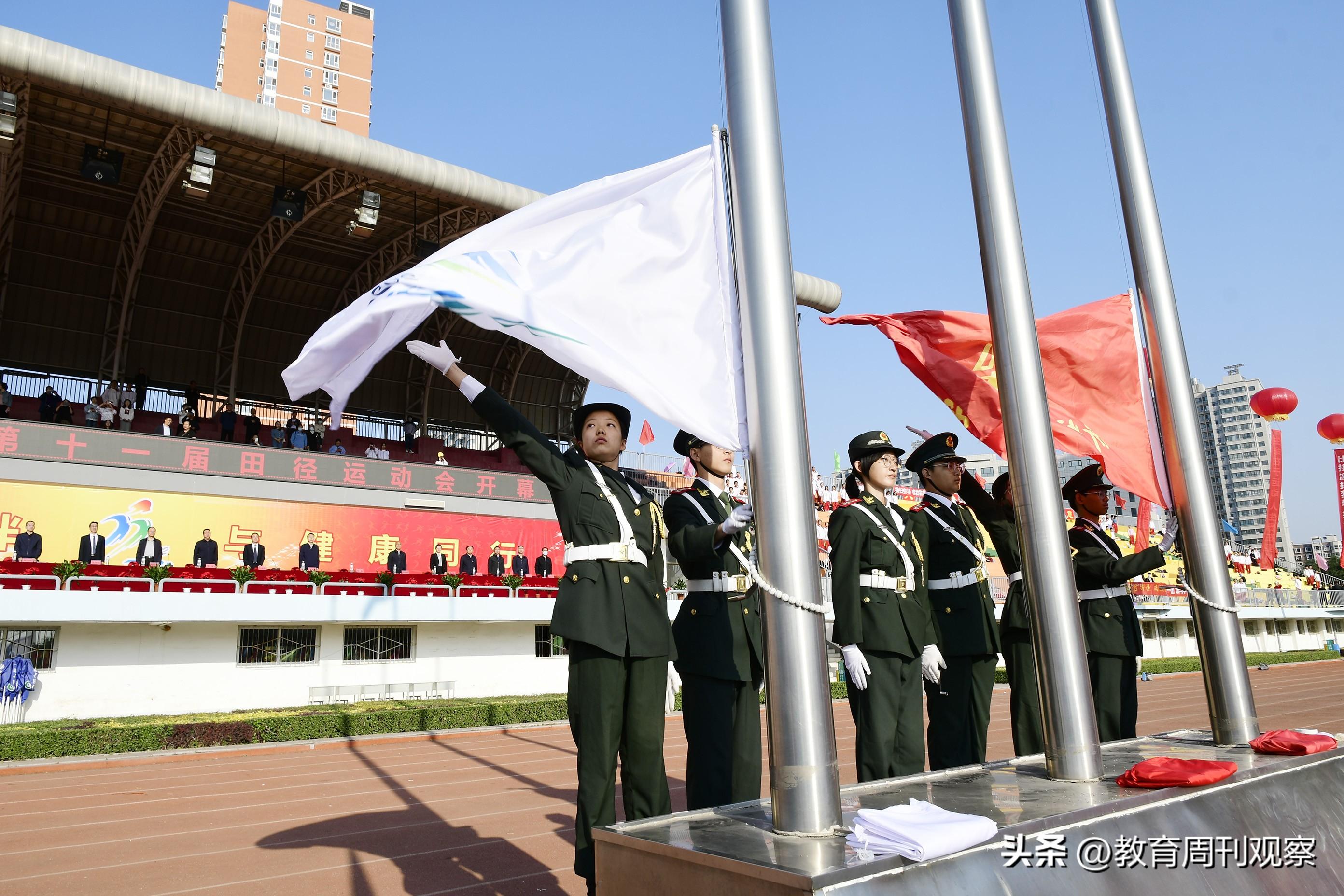 升国旗,奏唱国歌;升校旗、十一届田径运动会会旗,奏唱校歌。
