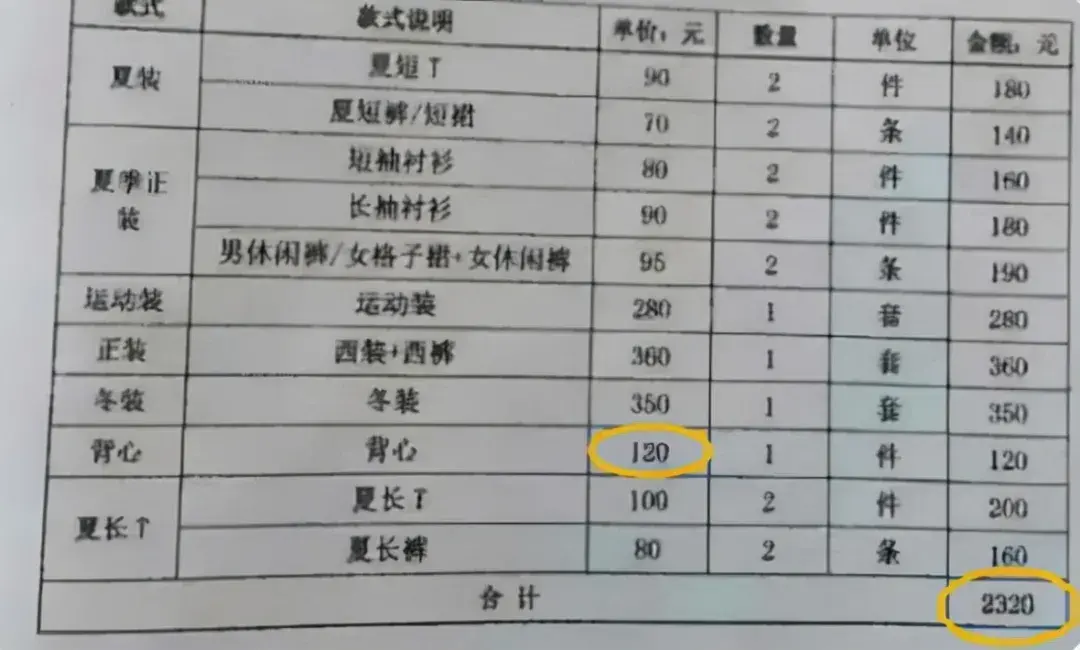 从校服缴费单中我们可以看到,大大小小的校服一共18件,最便宜的短裙、短裤是70一件,而最贵的是冬装,需要350一套。