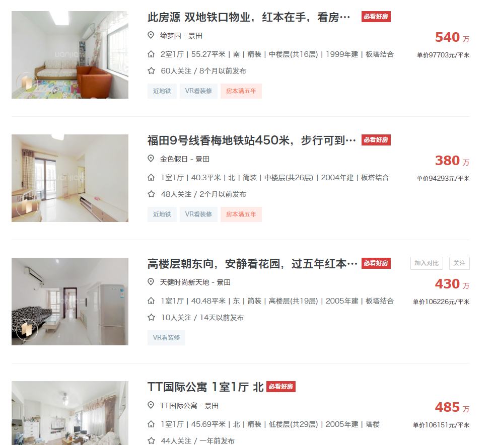 在链家官网筛选景田60㎡以下的房源有51套,总价从300多万到800万左右不等,房源相对较多而且门槛低。