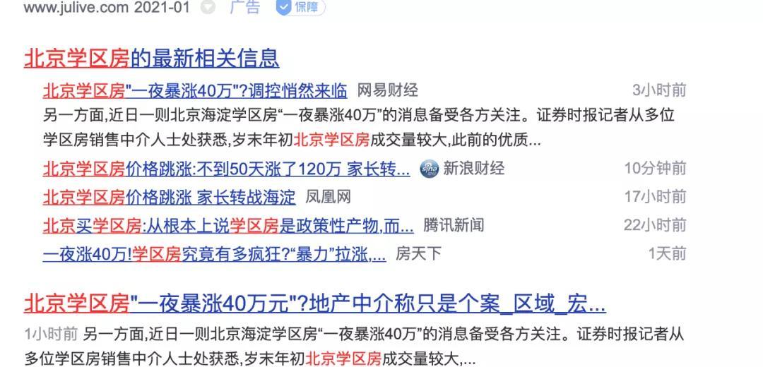 在搜索引擎上搜学区房,“北京学区房一夜暴涨40万”的消息占满最新信息。