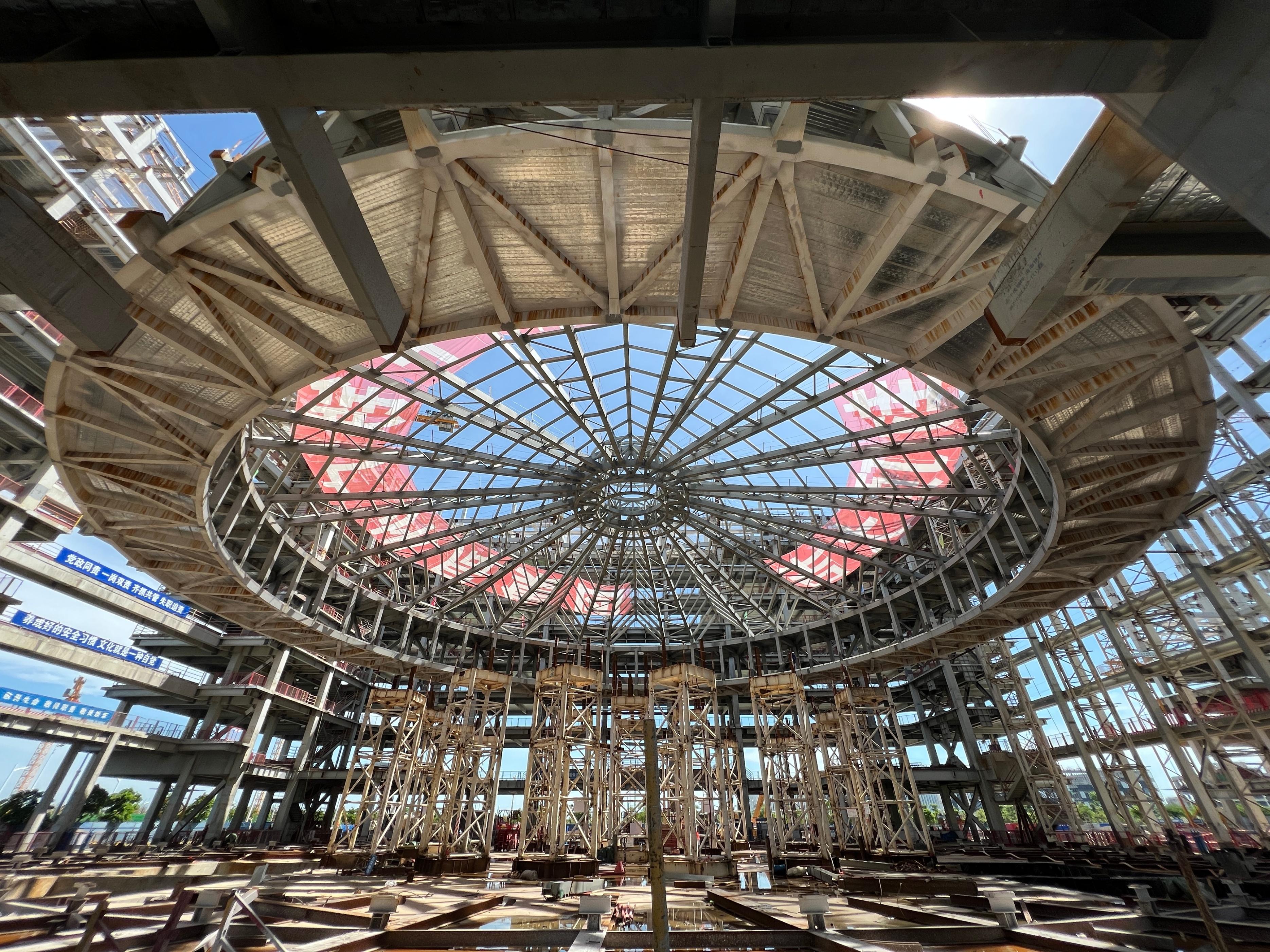 由于受限于内部悬空空间,主楼穹顶网壳无法分块吊装,经中铁广州局集团项目团队的多次技术攻关和模拟推演,现场采用“地面拼装+整体提升”进行安装,利用与主体结构相连接的16个吊点,根据每个吊点的不同反力值,采用额定提升力分别为180吨和75吨的两种提升设备,运用“超大型构件液压同步提升技术”,将其整体提升到位。穹顶提升作业是项目建设过程中的关键工序之一,将拼装完成的穹顶利用液压提升器从地面提升至52.5米高空,相当于完成一次“重量级托举”,与以往的同类型施工相比,本次提升构件尺寸之大、吨位之重、提升高度之高在海南省同类型施工中尚属首例。为确保提升的均步性,项目团队还设置了多个位移监测点,并分阶段对监测点进行实测,确保16个提升点在提升过程中误差控制在10毫米以内,最终实现了被提升结构与结构预装段的精确对接。