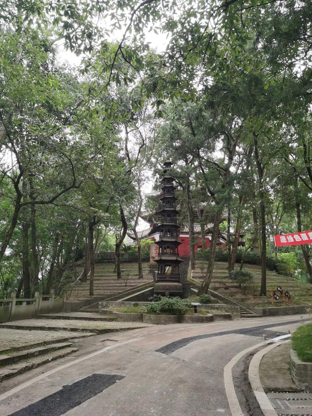 经过玉皇楼还有一座四角亭楼,一楼两层,名纯阳阁,为纪念八仙之一的吕洞宾而建。金华山前山便到此为止。从纯阳阁行经一段茂密的林荫小道再拾级而上,约百余步,即达金华山后山梧冈山。