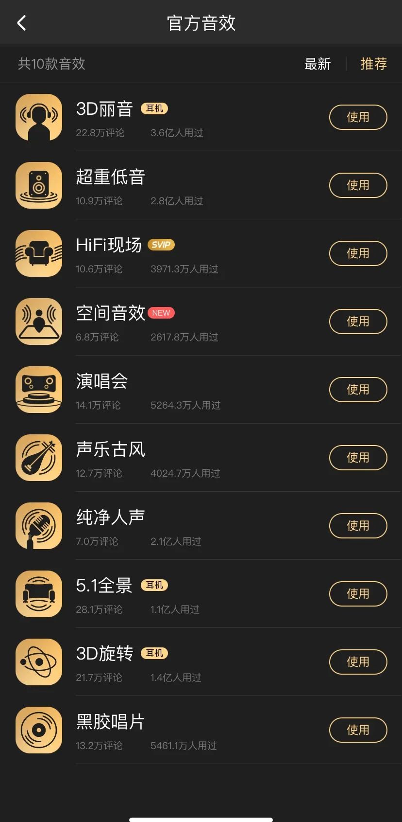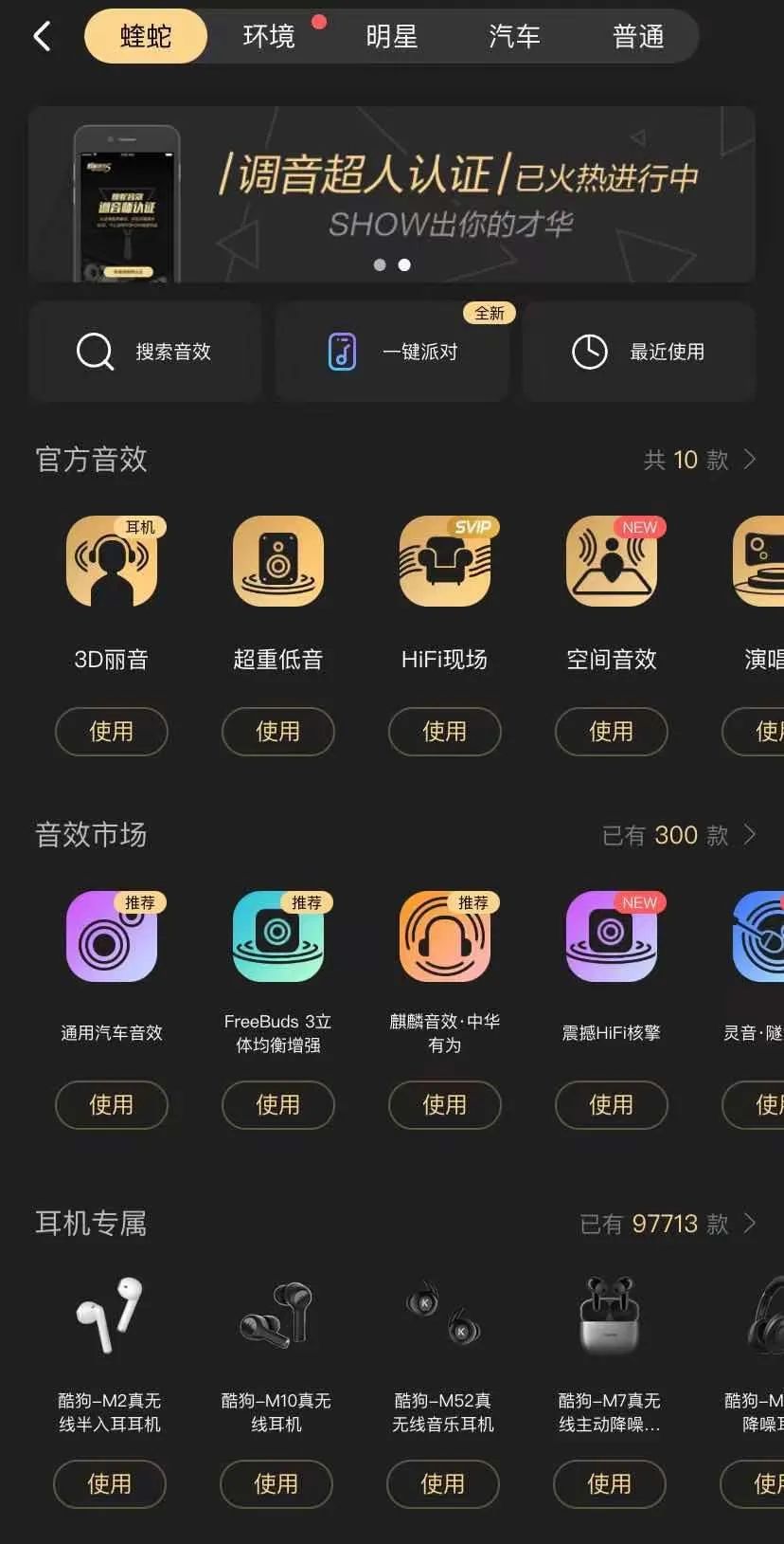 迄今,蝰蛇音效已积累一万多种个性化音效,其中3D丽音、超重低音、HiFi现场、3D旋转、5.1全景、黑胶唱片、声乐古风等10款官方音效最受欢迎。
