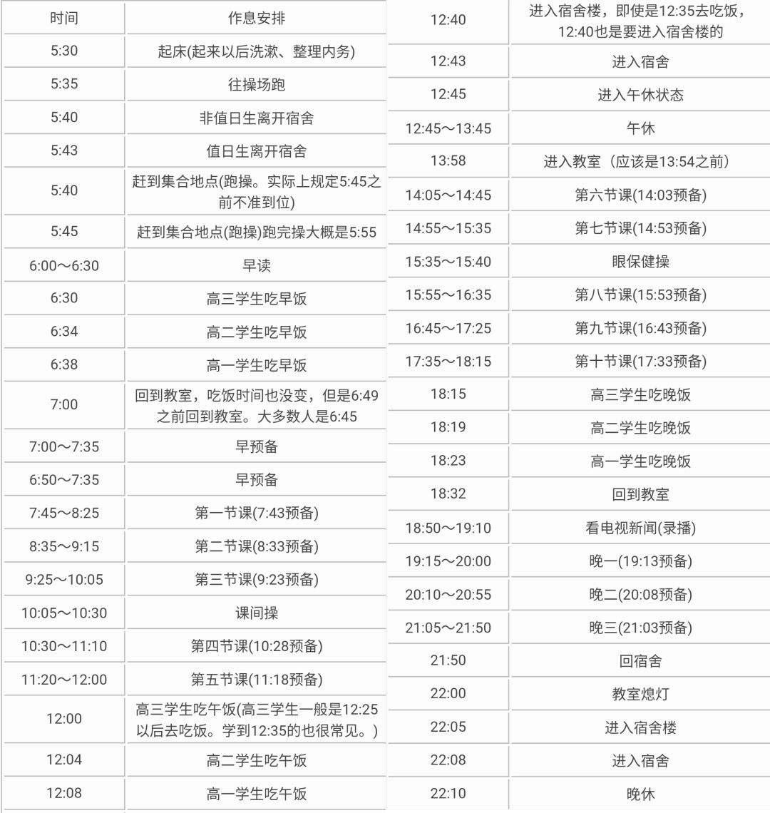 从这份时间表中,我们可以看出,衡水中学的管理是精确到分的,从早晨5:30起床到晚上10:10分所有时间都控制得满满当当,而且管理非常严格,规则渗透在各种学习和生活当中。