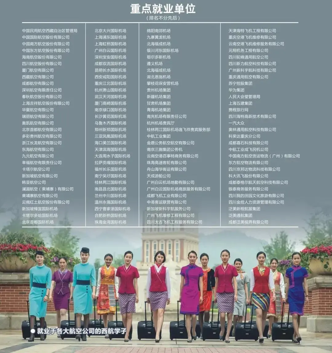 学院与国内外数百家民航及非民航单位建立了紧密合作关系,与几十家单位建立了定向人才培养基地。学院就业中心为毕业生学生开辟了广阔的就业渠道,毕业生主要就业于国际国内航空公司和民航机场以及世界500强企业,涵盖飞行、乘务、空保、无人机驾驶、飞机维修、安检、航空物流、贵宾服务、值机等各类民航岗位以及高端服务、行政管理等岗位。应届大专毕业生在就业中优势明显,受到用人单位的青睐。