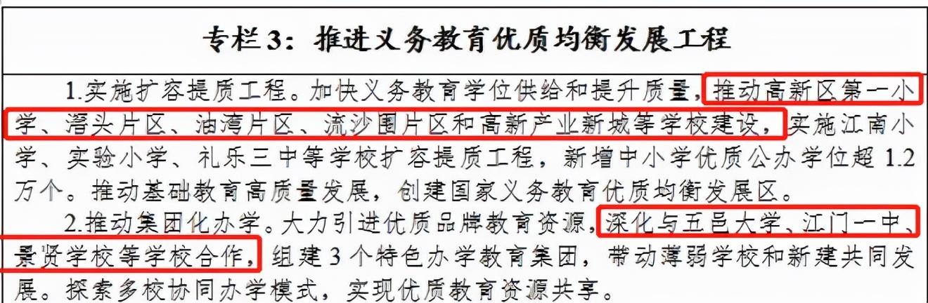 深化与五邑大学、江门一中、景贤学校等名校合作办学,充分发挥名校带动引领作用,高中方面实施高中扩容提质工程,新建一所高级中学,提供不少于3000个高中优质学位。