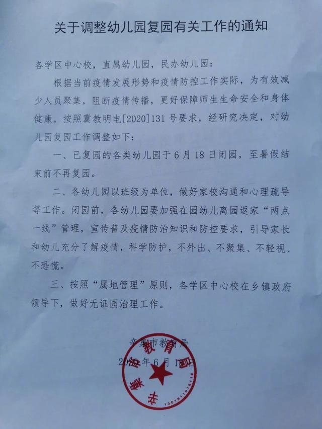 6月18日,辛集市教育局发布关于调整幼儿园复园有关工作的通知,要求已复园的各类幼儿园于6月18日闭园至暑假结束前不再复园。