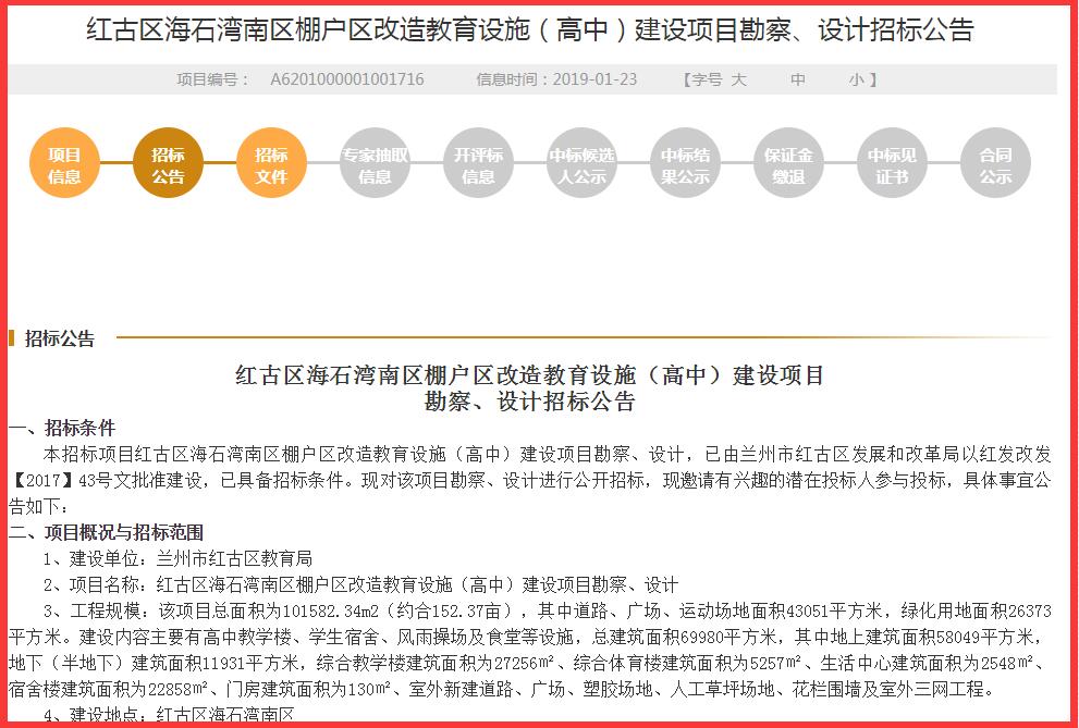 2019年1月23日,兰州市公共资源交易中心官网发布了:红古区海石湾南区棚户区改造教育设施(高中)建设项目勘察、设计招标公告。