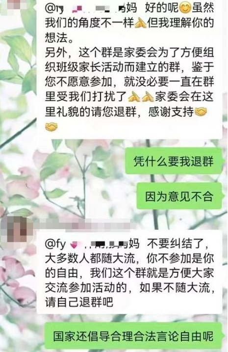 她有些不满质问凭什么让她退群,一位家长回复得比较直白,表示大多数人是随大流,她有反对意见自然不适合在一个群中。