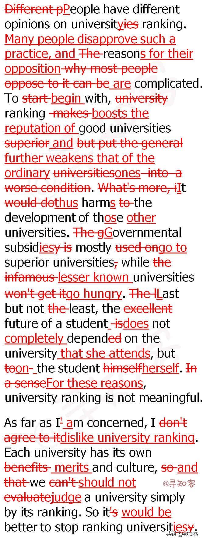 “I don't agree to it”—— 上面你说了很多,这里说you don’t agree to it; you don’t agree to what? 这里是结论,需要写得很清楚。改为,“I dislike university ranking”。