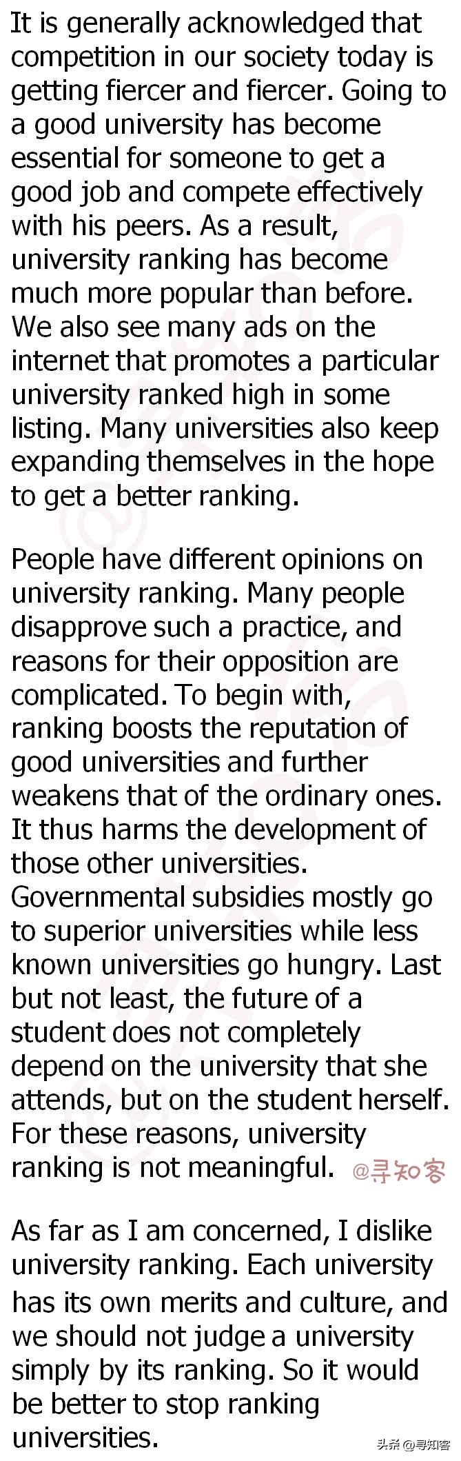 对于大学排名,人们有不同的意见。出于很多原因,许多人不赞成这种做法。首先,排名帮助好的大学提高知名度,但进一步削弱一般大学的声誉。这就影响到许多大学的发展。政府的各种补贴都发给了好的大学,而不知名大学经费紧张,难以度日。最后,但同样重要的是,一个学生的未来并不完全取决于她所上过的大学,而取决于她自己。鉴于所有这些原因,大学排名其实没有实质的意义。