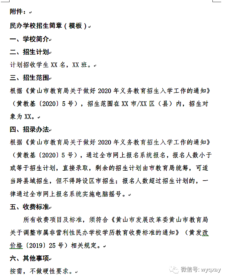 1.各区县教育局要结合实际制定2020年民办义务教育学校招生实施办法,合理核定学校招生计划,并通过全市网上报名系统统一发布。民办学校招生简章经属地教育主管部门审核后,在规定时间内向社会发布,不得含有违法违规内容,市级审批的民办学校招生简章(模板见附件)于7月3日前报市教育局审核。
