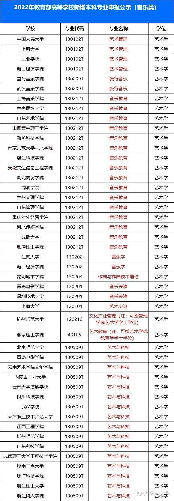艺术教育越来越受到国家的重视,众多一流院校,例如位于广东省,办学类型为双一流、211高校、985高校的中山大学,暨南大学、吉林大学等高校也开始招收音乐类本科生。音乐类专业方向也越来越多,教育部公布了官方文件。新增了众多艺术类专业,预计在2022或2023年招生。