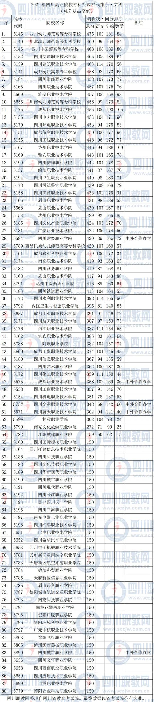 2021年四川高职院校专科批调档线排序-文科