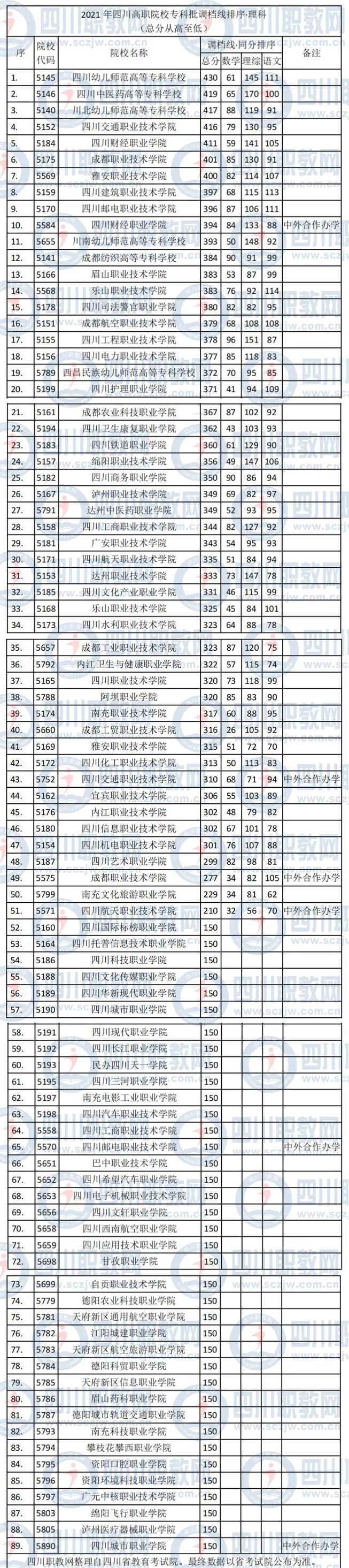2021年四川高职院校专科批调档线排序-理科