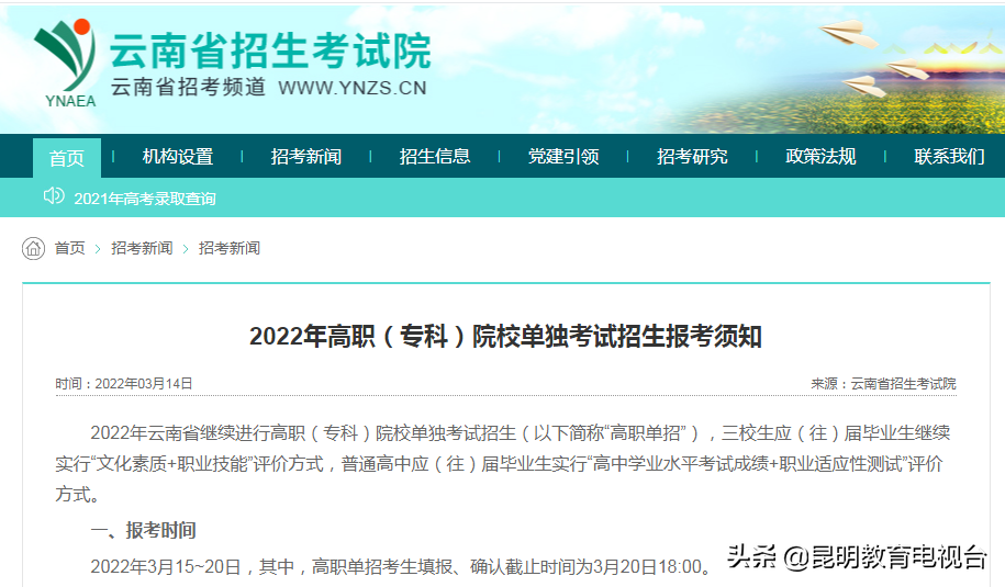 2022年云南省继续进行高职(专科)院校单独考试招生,昨天(3月14日),云南省招生考试院发布《2022年高职(专科)院校单独考试招生报考须知》,就报考时间、报考条件、报考流程等问题进行了明确。详细内容一起来看原文↓↓↓