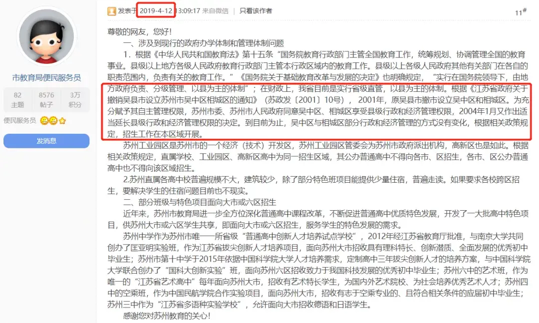 比如前面提到的学校不能互考,在2019年苏州官方便民网站,寒山闻钟论坛工作人员回复提到: