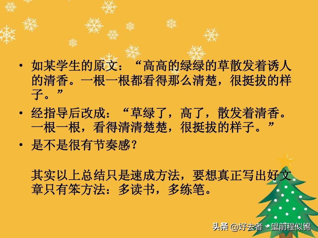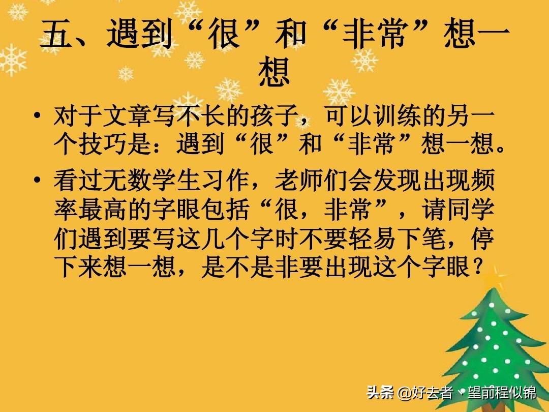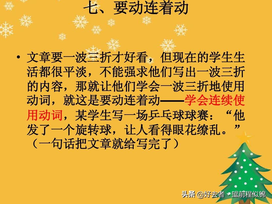 选材要鲜活。即选构要真实、新颖、典型,从生活中捕捉精彩的典型素材,筛选出那些最高兴、最悲痛、最深刻、最难忘、最能打动人心、最能展现时代风貌的典型事件,或者概括提炼,或者放大细节,或者定格镜头,必能写出具有、独特个性、深刻感悟和超级感染力的佳作来。情节通常包括事件的开端、发展、高潮、结局等几部分,如作文《一张贺卡》,作者以“贺卡”为线,围绕一个穷学生给老师“送贺卡”这件事展开生动描述,把“买贺卡”“送贺卡”“卖贺卡”三个场面一线串起,使文章曲折生动、感人至深;但在处理素材的详略时,却略写“送贺卡”,而把自己“买贺卡”前的思想斗争、老师“卖贺卡”后的感动心理浓墨重彩描述,这样就突出了一个正直、慈爱、善良的老师形象。