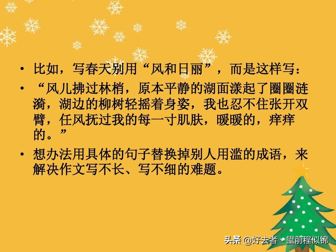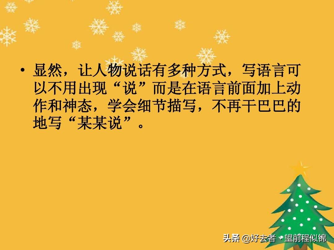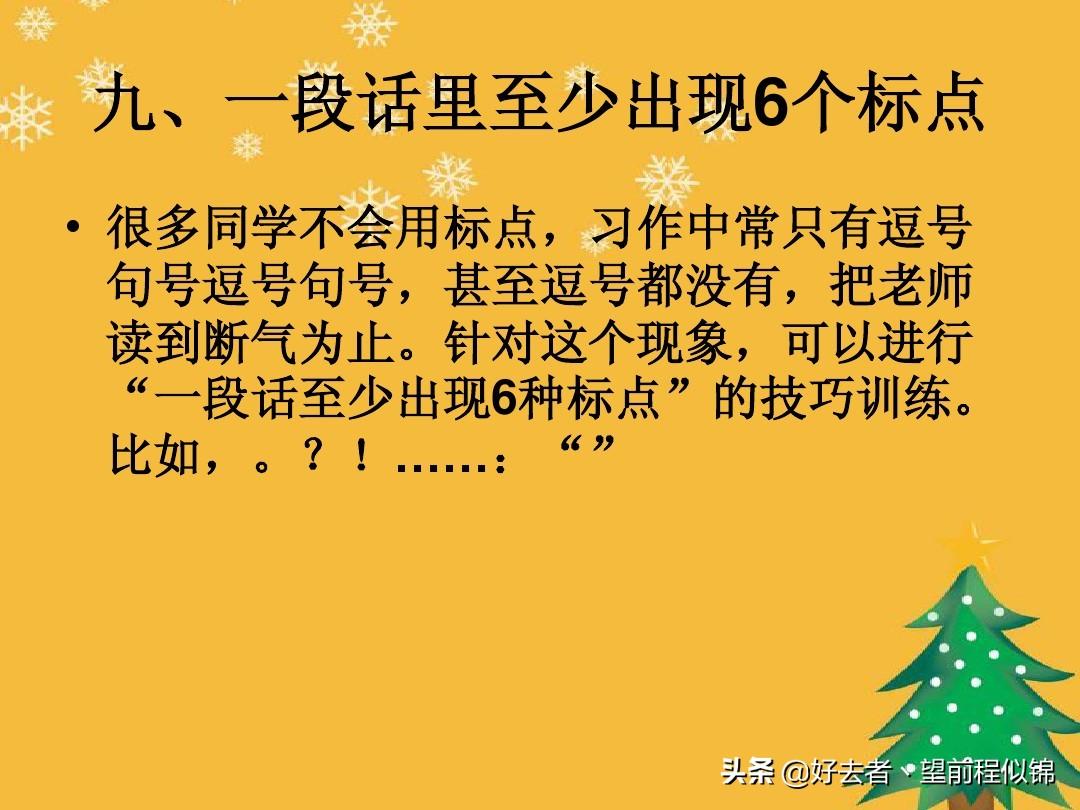 技巧五:个性人物,形象鲜明 写人记事的记叙文大多是通过塑造人物形象来揭示中心的。你可以通过个性分明的外貌、神态、服饰、语言、动作、心理等描写来展现人物的思想感情和性格特征。例如通过不同人物的语言便能体现出各自文雅有礼、粗鲁低俗、豪爽干脆、优柔寡断、风趣幽默、干巴木讷等迥异的性格。你也可以随着事件的发展或观察角度的变化,对人物进行多层次描写,或将正面描写与侧面描写相结合,特别要注意细节描写和概括描写相结合。