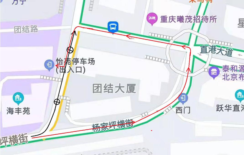 此外,原杨家坪环道正街至西城天街段左侧怡苑停车库及海丰苑停车库出入社会车辆,改为杨家坪正街段直行至团结路口天桥处左转进入环道,再左转进出停车库。