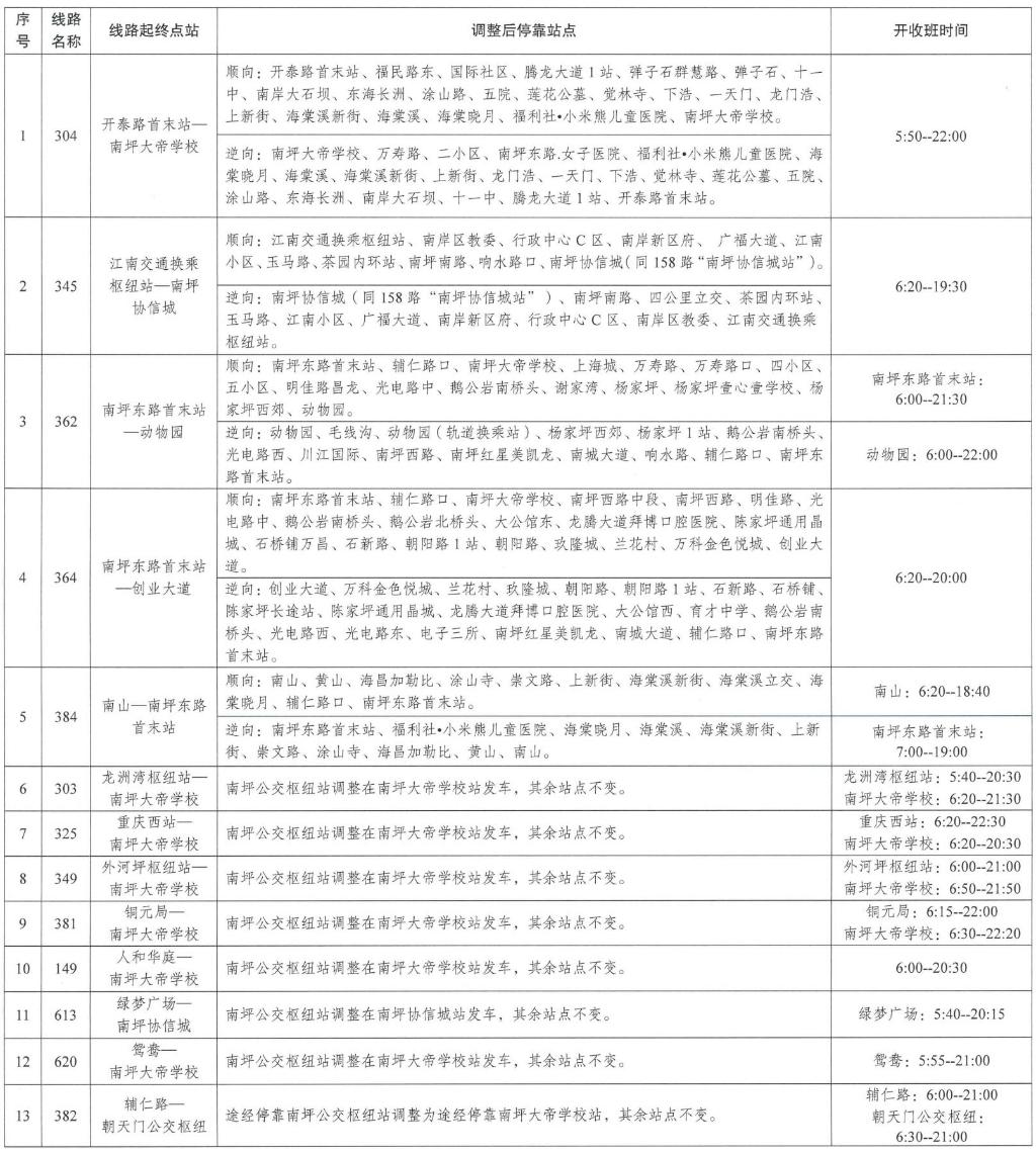 公交303、325、349、381、149、620路由原“南坪公交枢纽站”发车调整至“南坪大帝学校站”发车,其余站点不变;公交382路由原停靠“南坪公交枢纽站”调整至停靠“南坪大帝学校站”,其余站点不变。