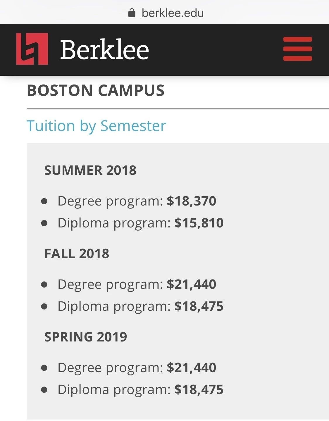 更要命的是这高昂的学费更让人觉得这是一所砸钱就能上的学校,以下是伯克利音乐学院官网上所发布的学费信息~