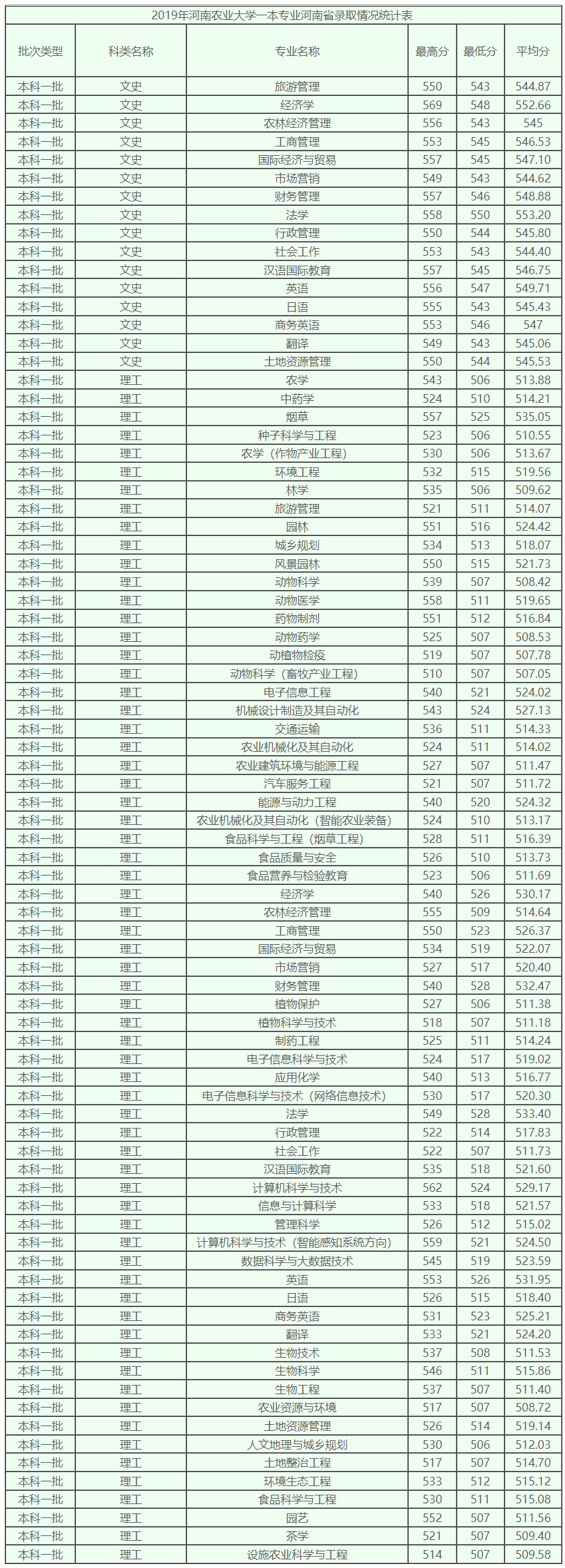 河南省本科一批招生专业(类、方向)45个:植物生产类(农学类)(包含农学、种子科学与工程)、智慧农业、中药学、林学类(包含林学、经济林)、生态学、旅游管理、园林、建筑类(包含城乡规划、风景园林)、动物医学类(包含动物医学、兽医公共卫生)、药物制剂、动物药学、动物生产类(包含动物科学、智慧牧业科学与工程、水产养殖学)、机械设计制造及其自动化、能源与动力工程、交通运输类(包含交通运输、汽车服务工程)、农业工程类(包含农业机械化及其自动化、农业建筑环境与能源工程、农业智能装备工程)、经济学类(包含经济学、经济与金融、国际经济与贸易)、工商管理类(包含农林经济管理、工商管理、财务管理)、轻工类(烟工类)(包含食品科学与工程(烟草工程)、香料香精技术与工程)、烟草、制药工程、植物保护、动植物检疫、植物生产类(园艺类)(包含园艺、设施农业科学与工程、茶学)、信息与计算科学、管理科学、计算机科学与技术、人工智能、生物工程、生物科学类(包含生物科学、生物技术)、食品科学与工程类(包含食品科学与工程、食品质量与安全、食品营养与健康)、农业资源与环境、土地整治工程、环境生态工程、土地资源管理、法学、社会工作、汉语国际教育、行政管理、化学类(包含应用化学、化学生物学)、电子信息科学与技术、外国语言文学类(包含英语、翻译)、日语、数据科学与大数据技术、计算机科学与技术(软件技术)。