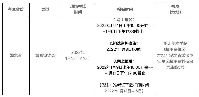 1.网上报名:考生必须使用“湖北美术学院2022年校考报名专用系统”(以下简称“报名专用系统”)进行网上报名,报名考生必须符合“湖北省美术与设计类统考成绩合格”的基本条件,且每名考生仅可报考一场。