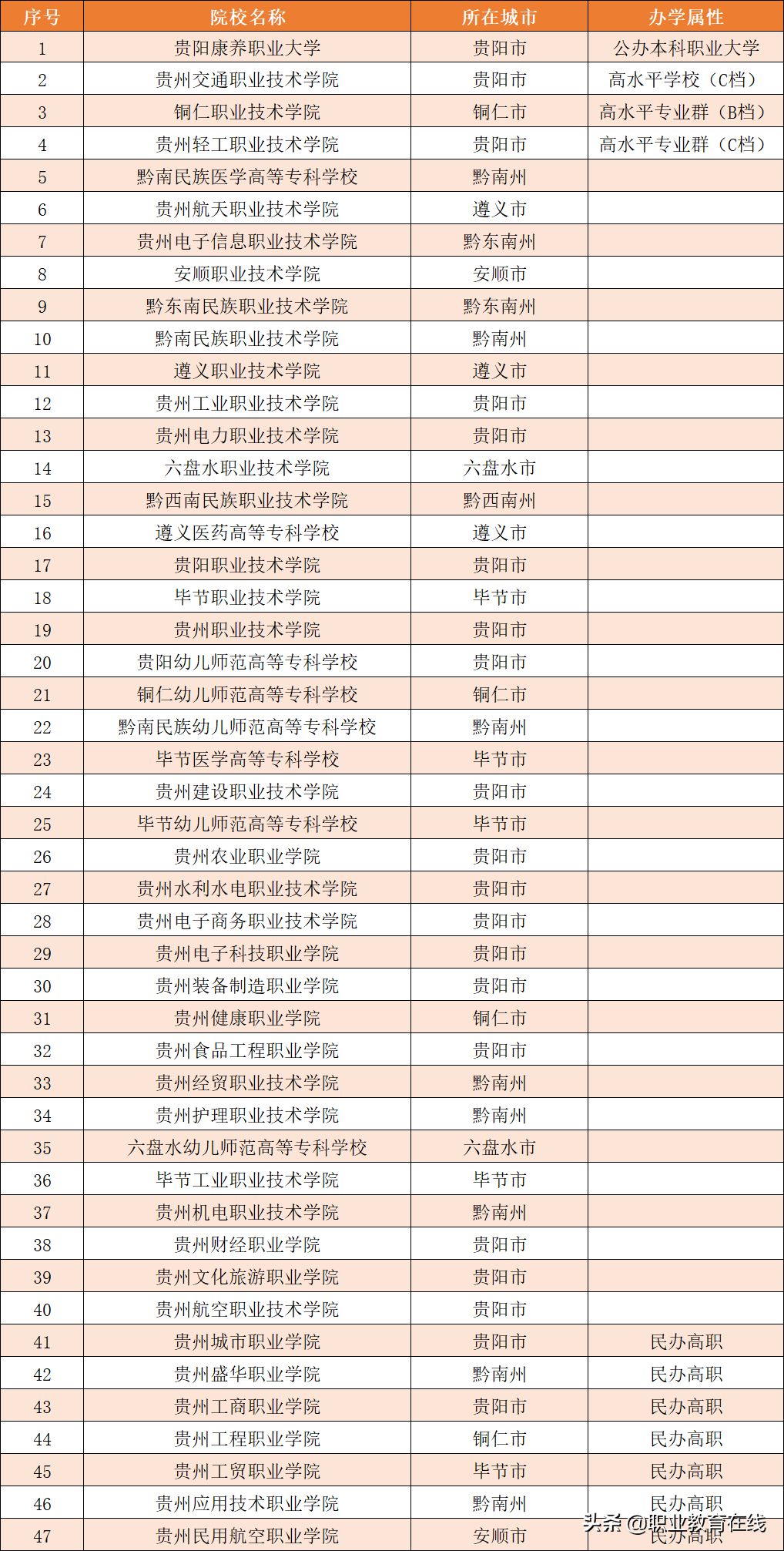 贵州的职业院校共47所,其中公办本科层次职业大学1所,公办高职高专39所,民办高职7所。39所公办高职中,有3所入选了国家双高计划,是最好的职业院校。具体名单如下: