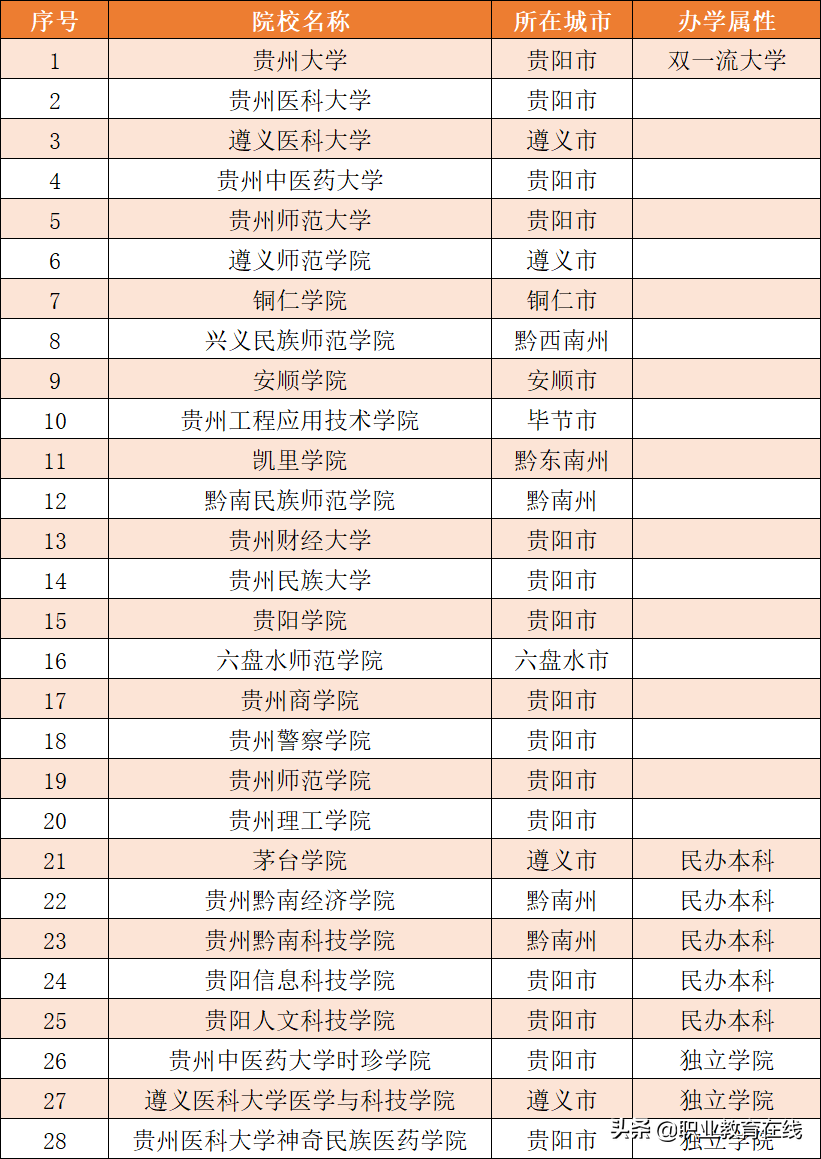 根据教育部的高校名单,贵州共有75所大学,其中普通本科院校28所,职业本科院校1所,高职高专院校47所。