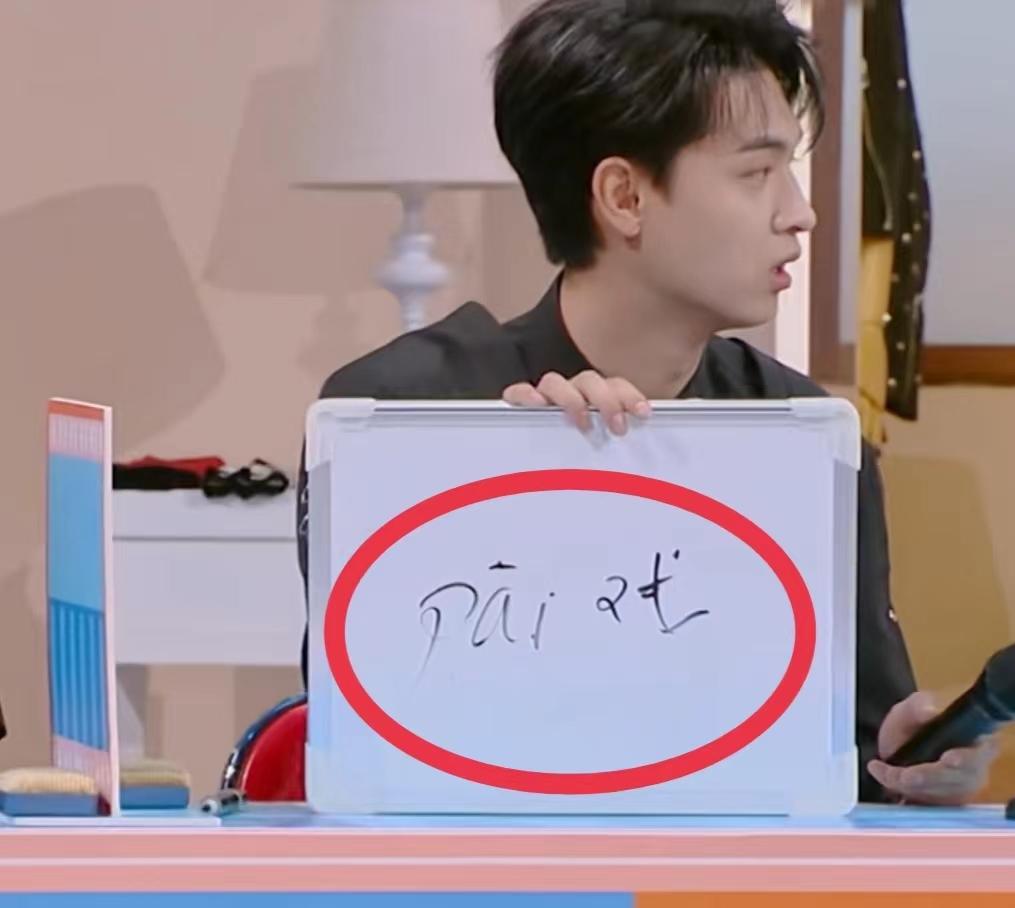 嘉宾们作答后依次亮出题板,李雪琴给出的答案是“拍戏”,而坐在旁边的秦霄贤也认为正确答案是拍戏,但他的题板上却写着“pai戏”。