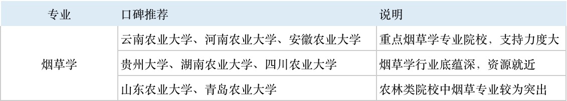 1、烟草学专业“招生少、专业性强、好就业、工资高”是一位业内人士对烟草学的评价,河南农业大学是我国最早创办烟草专业的高校,也奠定了这所院校在行业里的“翘楚”之位,强大的校友资源让烟草毕业生到全国各地岗位工作都能感受到河南农大人的亲切与温暖。