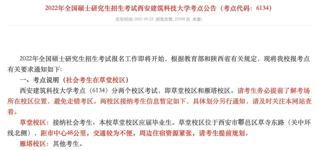 西安建筑科技大学在官网特别强调,该校有两个校区,尤其是草堂校区距离市中心48公里,交通较为不便,周边住宿资源紧张,请考生提前做好规划。