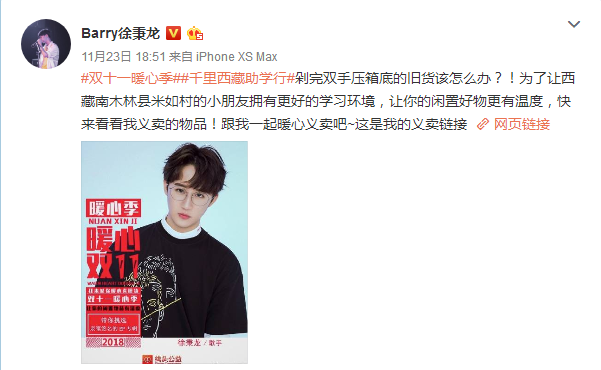 11月,徐秉龙参与了#双十一暖心季#"千里西藏助学行"的义卖活动,通过线头公益平台一元起拍义卖一件私人物品。希望通过这次义卖活动能够帮助到更多的孩子们!"徐秉龙这次暖心传递,我们已经实时联系到日喀则米如村的孩子们。在得知徐秉龙帮助了他们,并且未来可能会见到他们,孩子们非常的感动。每次有爱心人士愿意去帮助他们并且号召大家一起来参与本次公益活动,都让他们心存感恩与感谢!