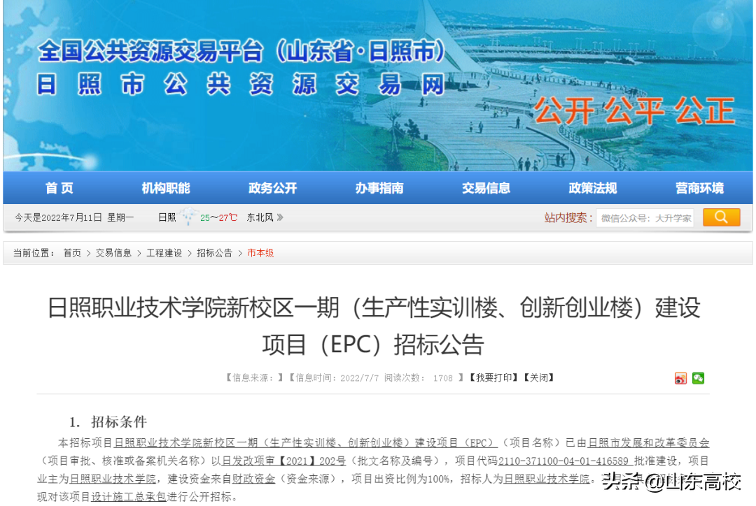 2022年7月7日,日照市公共资源交易网发布了《日照职业技术学院新校区一期(生产性实训楼、创新创业楼)建设项目(EPC)招标公告》。
