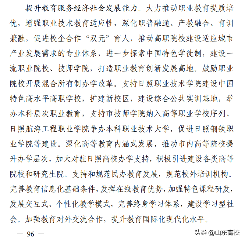 坚持实事求是、集中集约、分步实施的原则,以产教科城融合为特色,以服务区域产业发展、社会全面进步为根本,在涛雒镇建设日照职业技术学院新校区。新校区依托周边钢铁、汽车等产业基地,聚焦先进制造业发展,开设20个左右专业,规划全日制在校生规模10000人左右,为相关产业发展培养急需的技术技能人才、提供技术技能支持、开展科研创新服务等。(市教育局、市发改委、市财政局、市自然资源和规划局、市住房和城乡建设局负责)