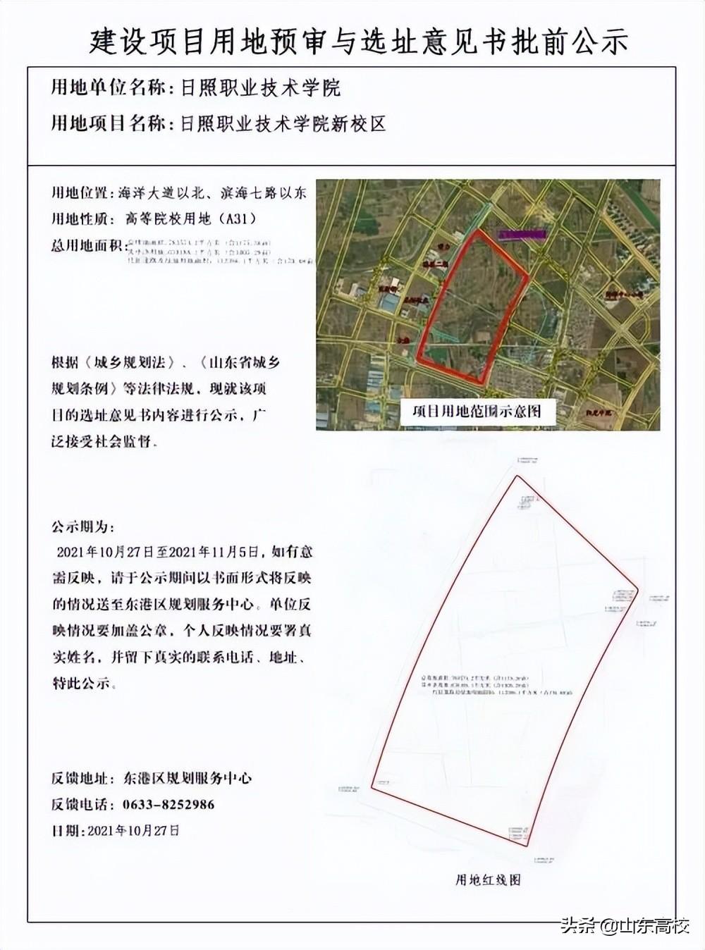 2021年10月28日,日照市自然资源和规划局发布日照职业技术学院新校区用地预审与选址意见书批前公示。公示显示,日照职业技术学院新校区位于海洋大道以北、滨海七路以东。总用地面积:783574.2平方米(合1175.36亩),其中净用地:670188.1平方米(合1005.28亩),代征道路及绿地用地面积113386.1平方米(合170.08亩)。