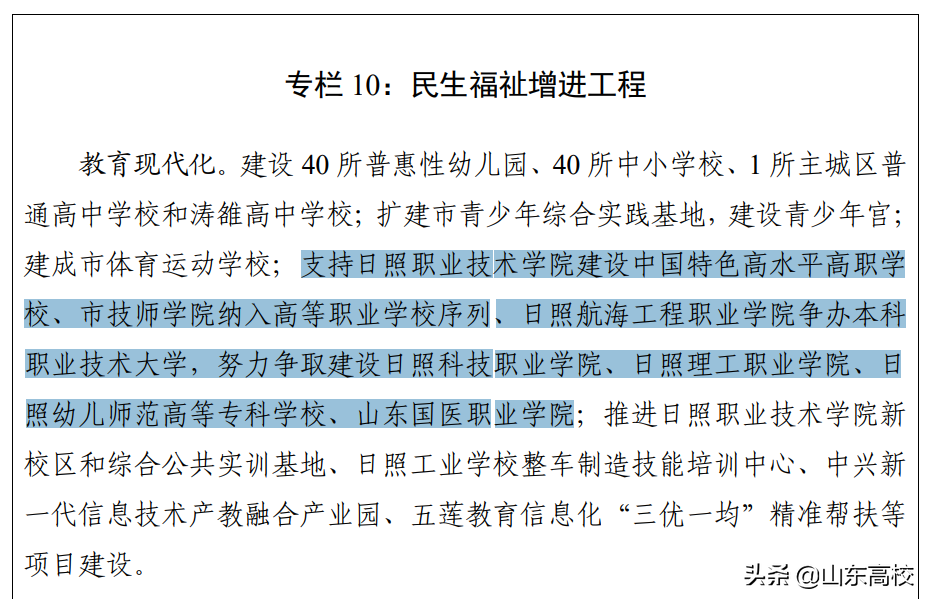 2021年6月30日,日照市人民政府印发《日照市国民经济和社会发展第十四个五年规划和2035年远景目标纲要》(日政发〔2021〕7号),提出支持日照职业技术学院建设中国特色高水平高职学校,扩建新校区,建设综合公共实训基地,举办本科层次职业教育。在“民生福祉增进工程”专栏再次提到,支持日照职业技术学院建设中国特色高水平高职学校。