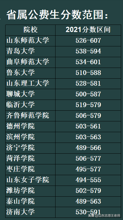 省属公费师范生分数就不是很高,大部分考生都能够得到,学校层次都是山东省内的普通本科院校,共计有17所,山东师范大学,曲阜师范大学,鲁东大学,青岛大学,济南大学,山东理工大学,齐鲁师范学院,潍坊学院,滨州学院,济宁学院,德州学院,枣庄学院,泰山学院,菏泽学院,山东女子学院,聊城大学,临沂大学。分数区间跨度也比较大,从500分左右到600多分都有。