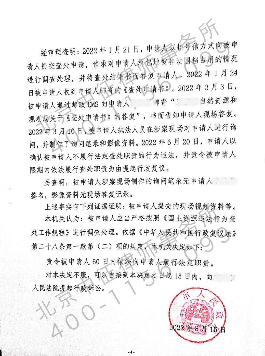 北京中征律师事务所接受委托后,成立维权办案组,第一时间启动律师沟通函、信息公开、查处申请、行政复议等程序。2022年1月21日,在案件主办律师郭华丽的指导下,李先生向该市自然资源和规划局邮寄了违法占地的查处申请书,对方签收后法定期限内并未予以答复。