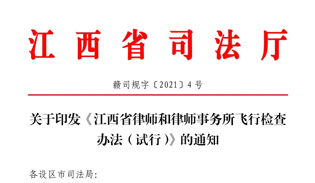 为强化对律师、基层法律服务工作者和律师事务所、基层法律服务所的监管工作,进一步促进依法依规执业,落实落细监管部门的属地管理责任,在总结宜春市试点工作的基础上,近日,江西省司法厅正式出台《江西省律师和律师事务所飞行检查办法(试行)》(以下简称《办法》)。