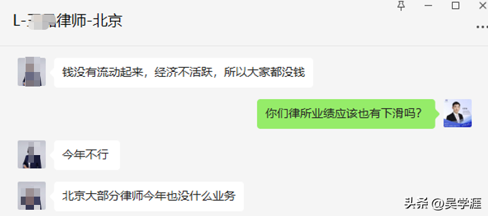律所业绩下滑已经成为共识,北京律师和我说今年业绩完全不行,北京大部分律师今年都没有什么业务。